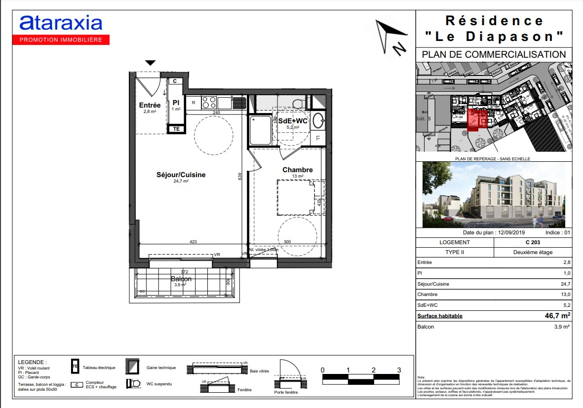 Situé près des commerces, établissements scolaires, et services. Au nord du centre-ville à 300 mètres de la station de tramway Marne, nous vous proposons dans la résidence neuve LE DIAPASON TRANCHE 1, un appartement T2 de 46.70m². Situé au 2e étage, il comprend un séjour de 24.70m², une cuisine aménagée et équipée ouverte donnant sur un balcon de 3.90m², une chambre de 13m², une salle d’eau et un WC séparé.