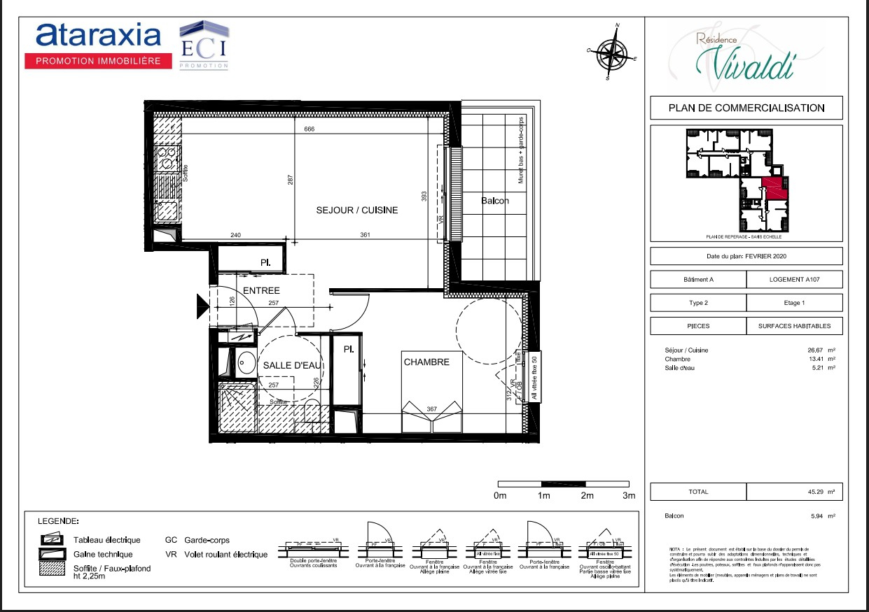 Résidence VIVALDI : appartement T2 , d’une superficie de 45.29 m² situé au 1er étage. Il se compose d’un séjour-cuisine avec placard de 26.67 m² comprenant une cuisine aménagée et équipée (hotte, plaque induction et évier) et donnant sur un balcon de 5.94 m², d’une chambre avec placard de 13.41 m² et d’une salle d’eau avec WC.
