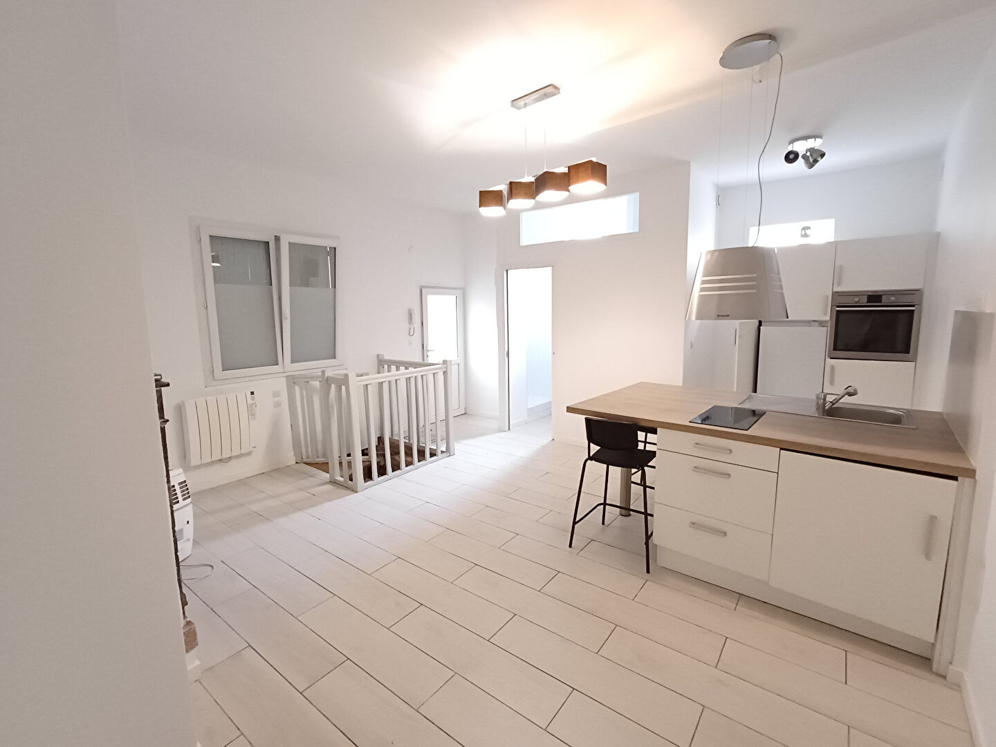 – Au rdc : d’une pièce de vie de avec cuisine aménagé et équipée (un four, une plaque, une hotte, un frigo, et un lave-linge), une salle d’eau avec WC.