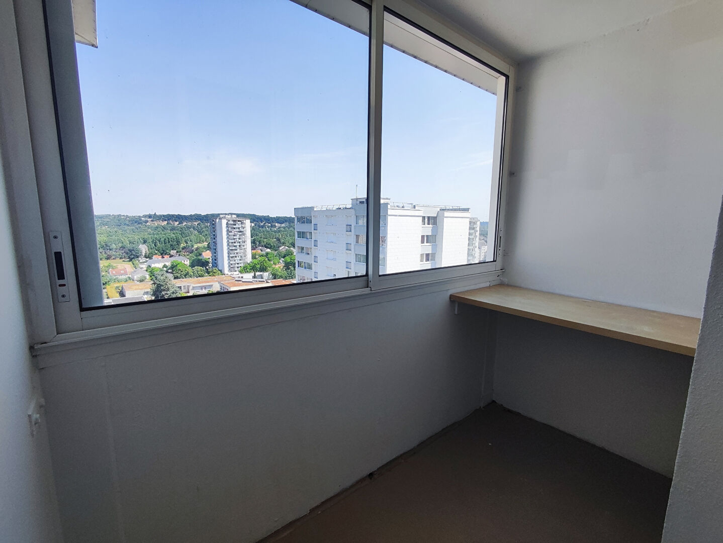 Grand T4 au dernier étage comprenant une entrée avec placard, un double salon séjour avec grande loggia et vue sur Tours, une cuisine semi séparée aménagée et équipée (hotte, plaque de cuisson, four) avec loggia, deux chambres lumineuses, une salle de bains, un WC séparé.