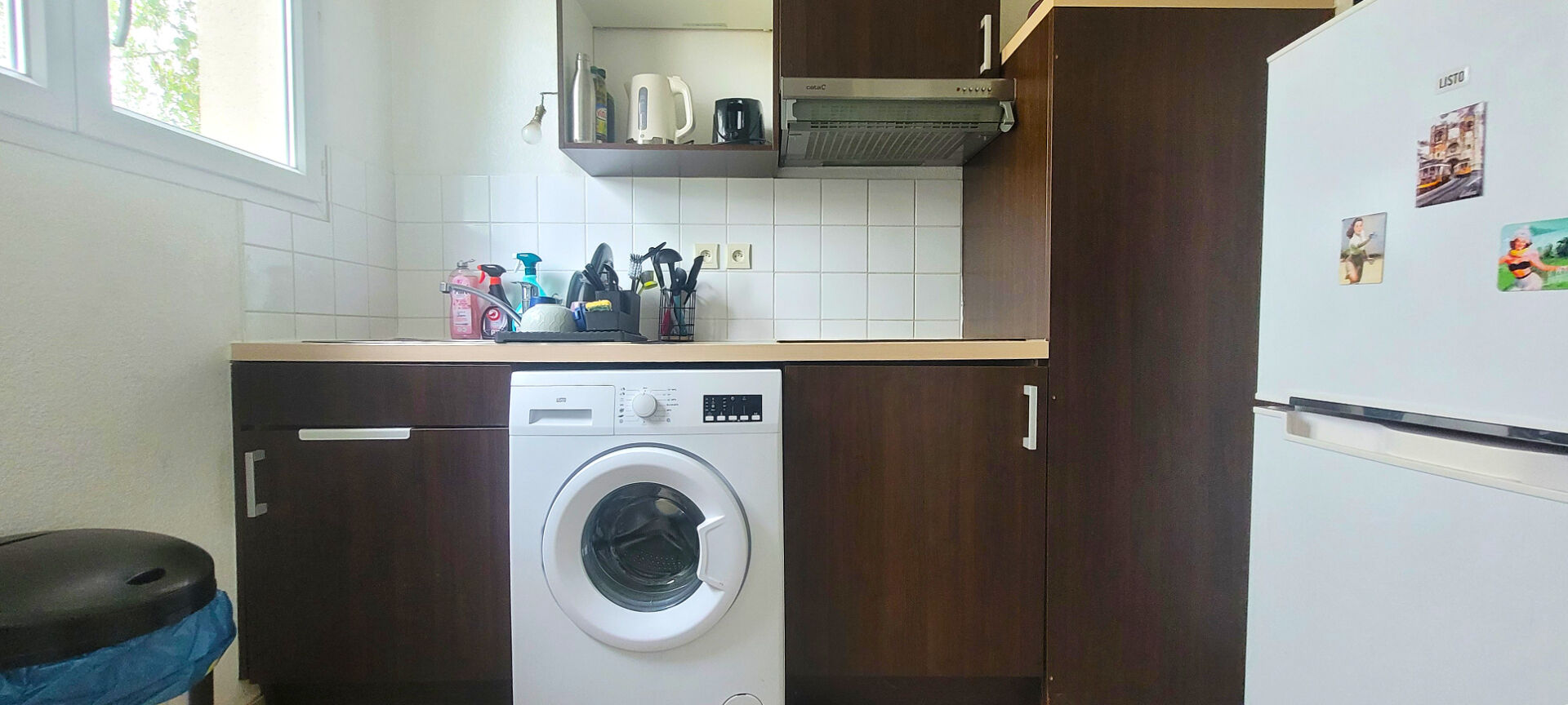 une cuisine aménagée et équipée (plaques, hotte), un séjour, une chambre avec placard mural et une salle de bains avec wc.